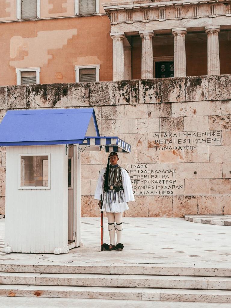The Changing of the Guard happens outside the Presidential Mansion (just off Syntagma Square) every 30 minutes. It really is a spectacle – we learned the white shirts of the Guards’ uniforms symbolise purity, the pleating is made from over 30 metres of fabric and features 400 pleats to represent the liberation of Greece from the years of Ottoman occupation, and the colours include blue to represent the greek flag.