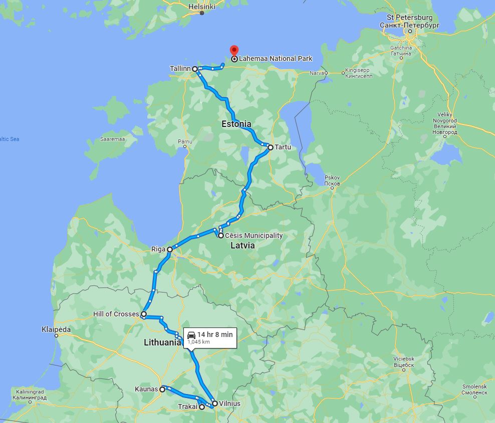 The route we followed on our trip took us through all 3 countries as per the map above. At the very bottom of the map you can see Kaliningrad – this is a small area of Russia below Lithuania. Then to the right you will see St Petersburg, also in Russia, with Belarus the country sharing a border with Lithuania and Latvia.