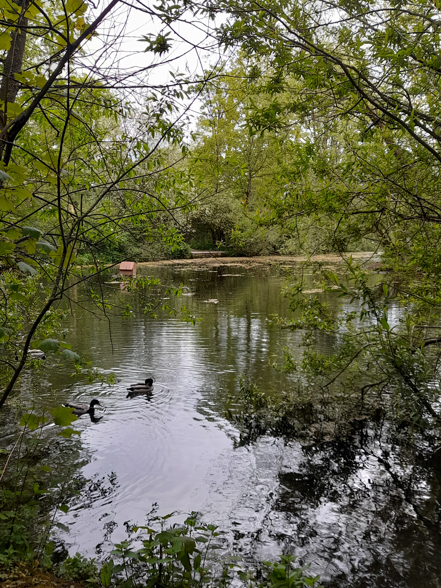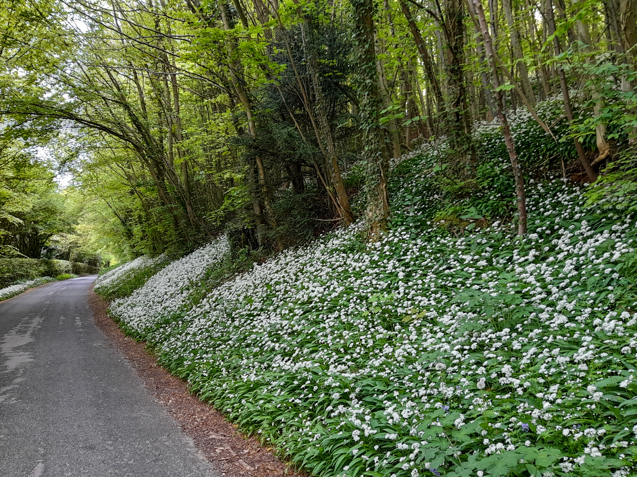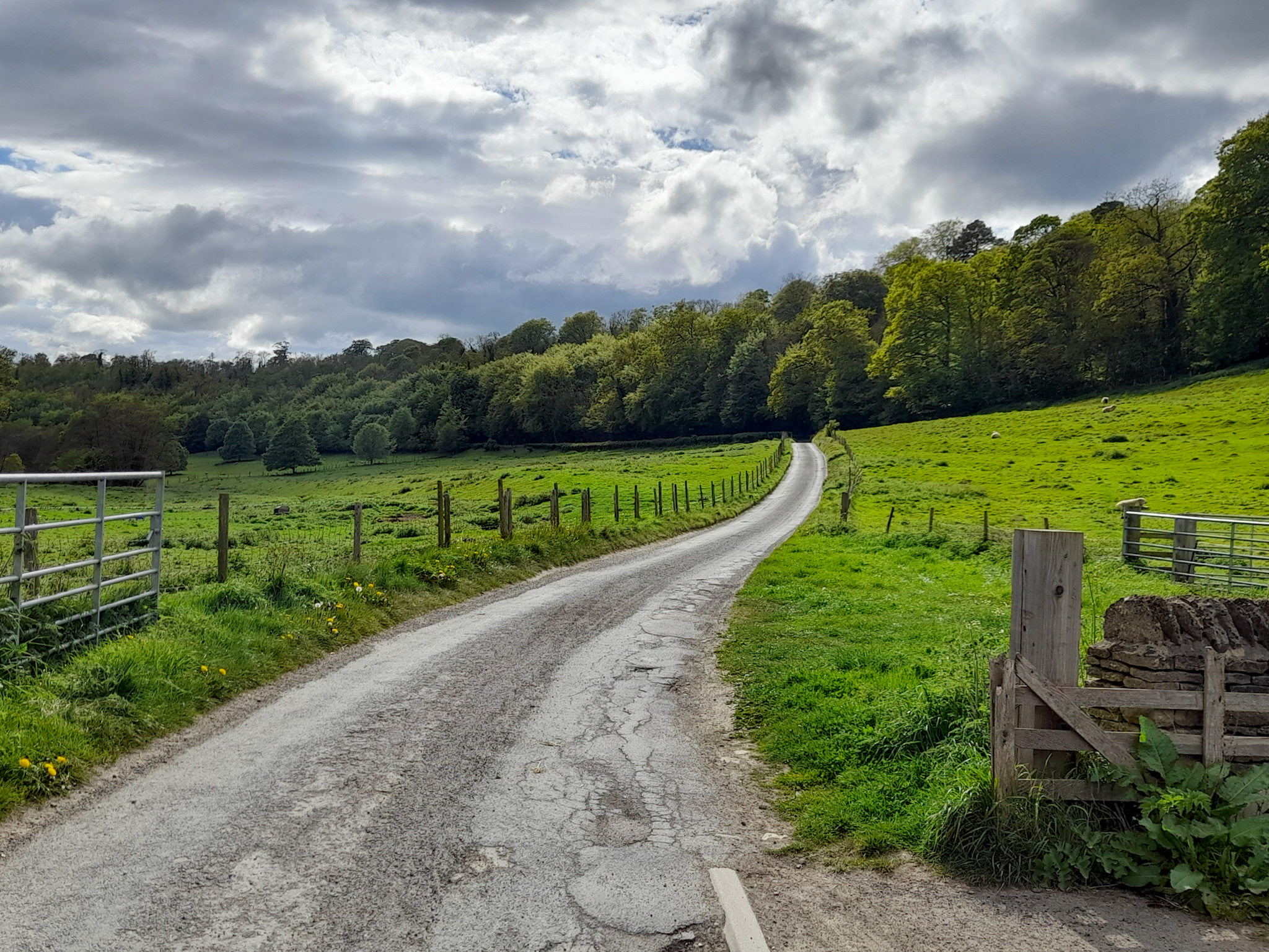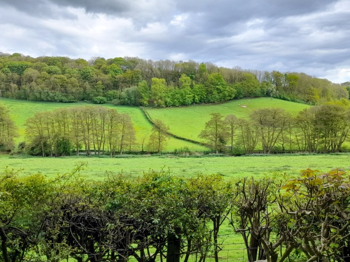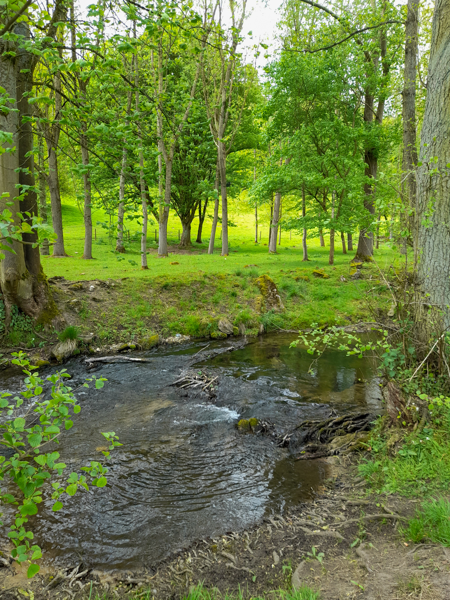 Continue following the path round until you reach a road, where you turn left and follow alongside the stream again until it passes under a road, where you turn right between the stream and the hedgerow and head in to the woodland and fields.