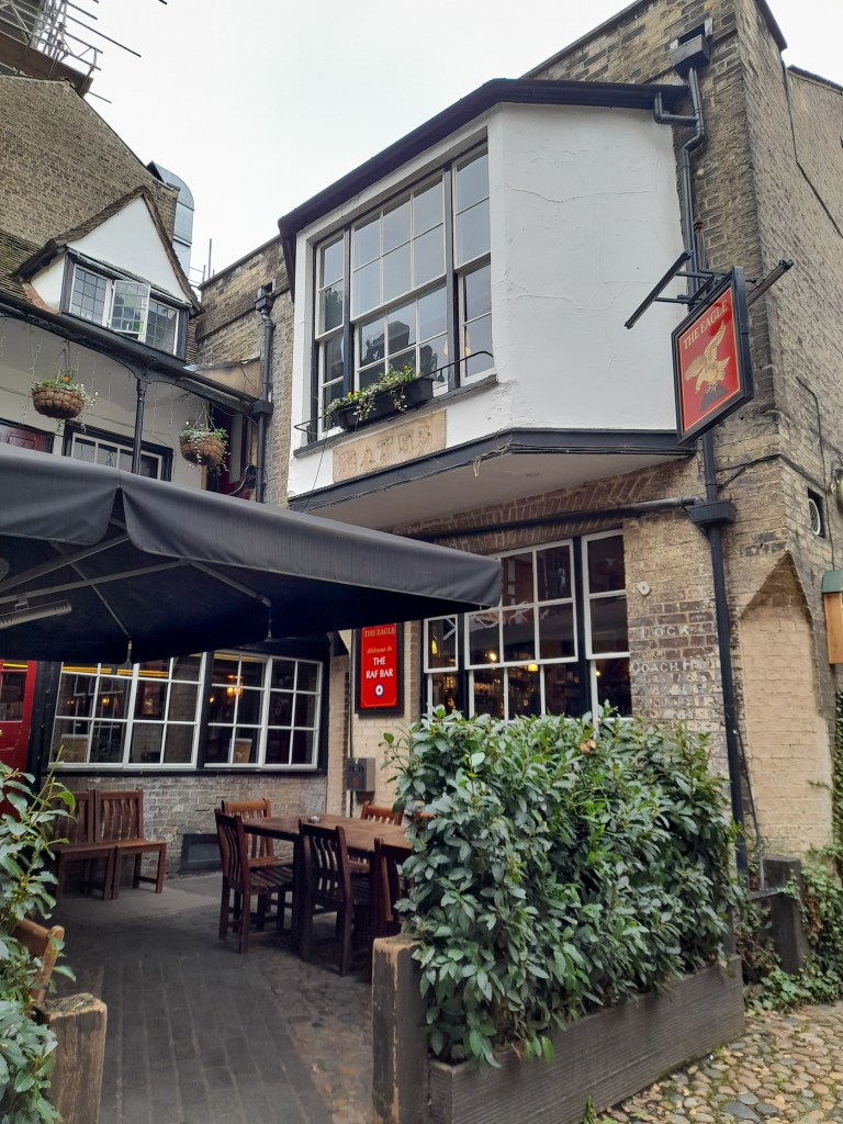 After visiting the clock, we headed to The Eagle Pub, the most famous in Cambridge. It’s famous for two reasons, the first being that Watson and Crick announced their discovery of DNA here in 1953 (Note: Rosalind Franklin’s research was critical to this but she was left out from the narrative and wasn’t honoured with the Nobel Prize like the men). This pub was also where many RAF pilots came to drink before flying to war in WW2, and they wrote notes on the walls, meaning it’s become a pilgrimage site for RAF servicemen and women today.