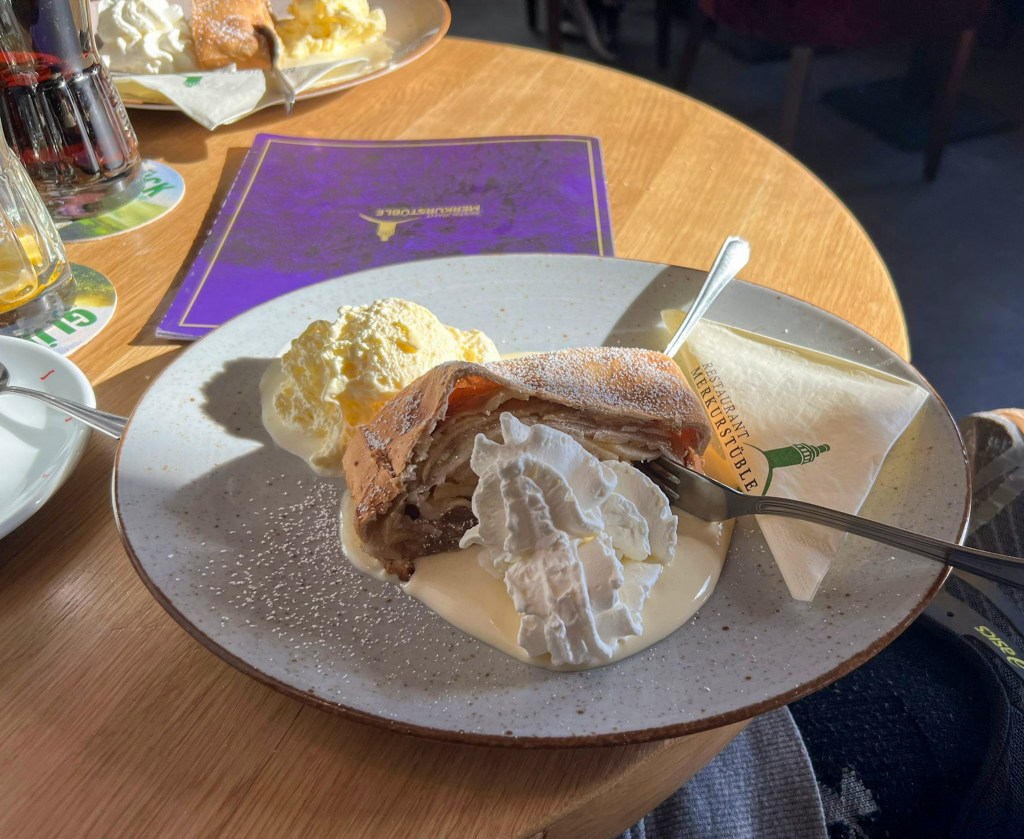 Arriving at the Merkur Talstation is the end of the section 1 of the route. However, we couldn’t resist going up! Merkur is Baden Baden’s resident mountain, and there’s a funicular railway up, or you can walk. With 10km in our legs and a flight to catch, we took the funicular. At the top people were paragliding off, there were more beautiful views and there was a cafe where we had lunch – Gulasch soup and apple strudel for me!
