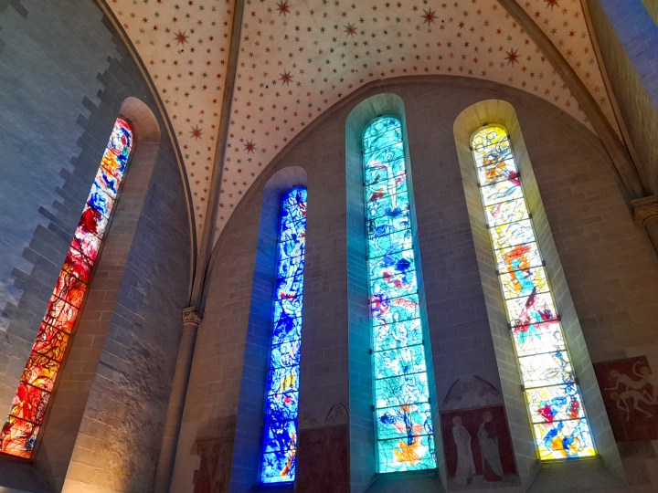 Its most stunning treasures which mean it’s definitely worth a visit are the stained glass windows: those in the north transept are by Augusto Giacometti and the five-part cycle in the chancel are the famous works of Marc Chagall.